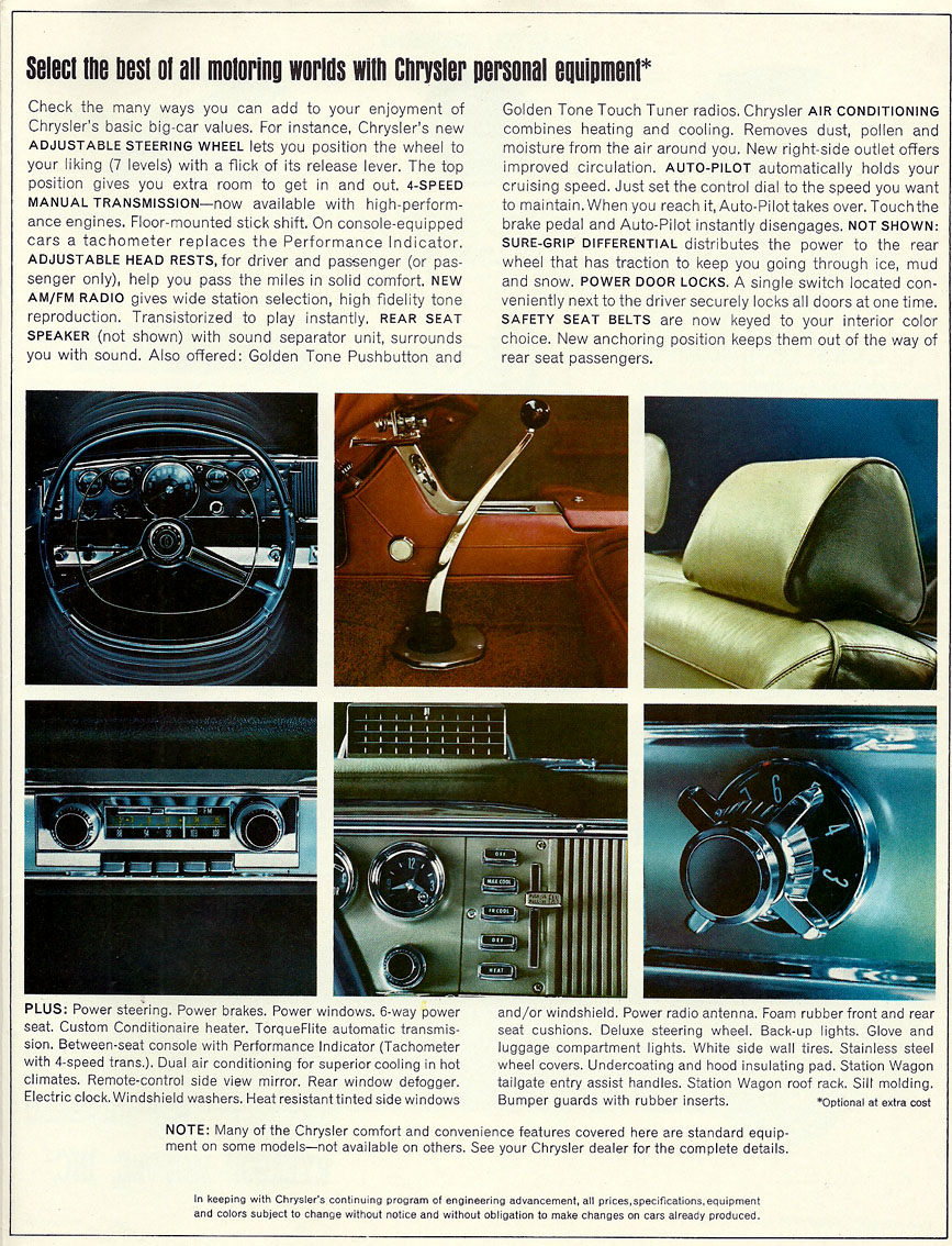 Power steering in Newport and 300, standard in other ($108). Power brakes in Newport and 300, standard in other's ($48). Power windows, all models ($108). Six-Way power seat in Newport and New Yorker ($102). Power door locks in four-door styles ($56). Heater and defroster, all models ($102). Air conditioning, all models ($510). DeLuxe dual air conditioning, all except convertibles ($714). Golden Tone radio, all models ($93). AM/FM radio, all models ($157). Golden Touch Tuner radio, all models ($129). Center Console in all 300 models ($129). Leather trim in 300 and 300K ($94). Leather trim in New Yorker Salon ($72). Seat belts, all models ($7). Heavy-duty springs, shocks, swaybar and brakes ($36). Adjustable steering wheel, all models ($47). Undercoating, all models ($18). Tinted glass, all windows ($43).